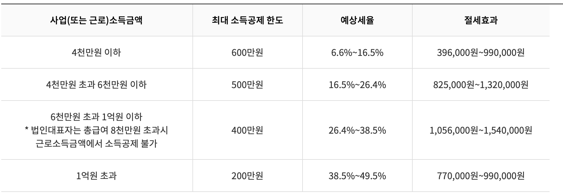 - 연소득 4000만 원 ~ 1억 원 → 최대 400만 원 공제 (기존 300만 원)